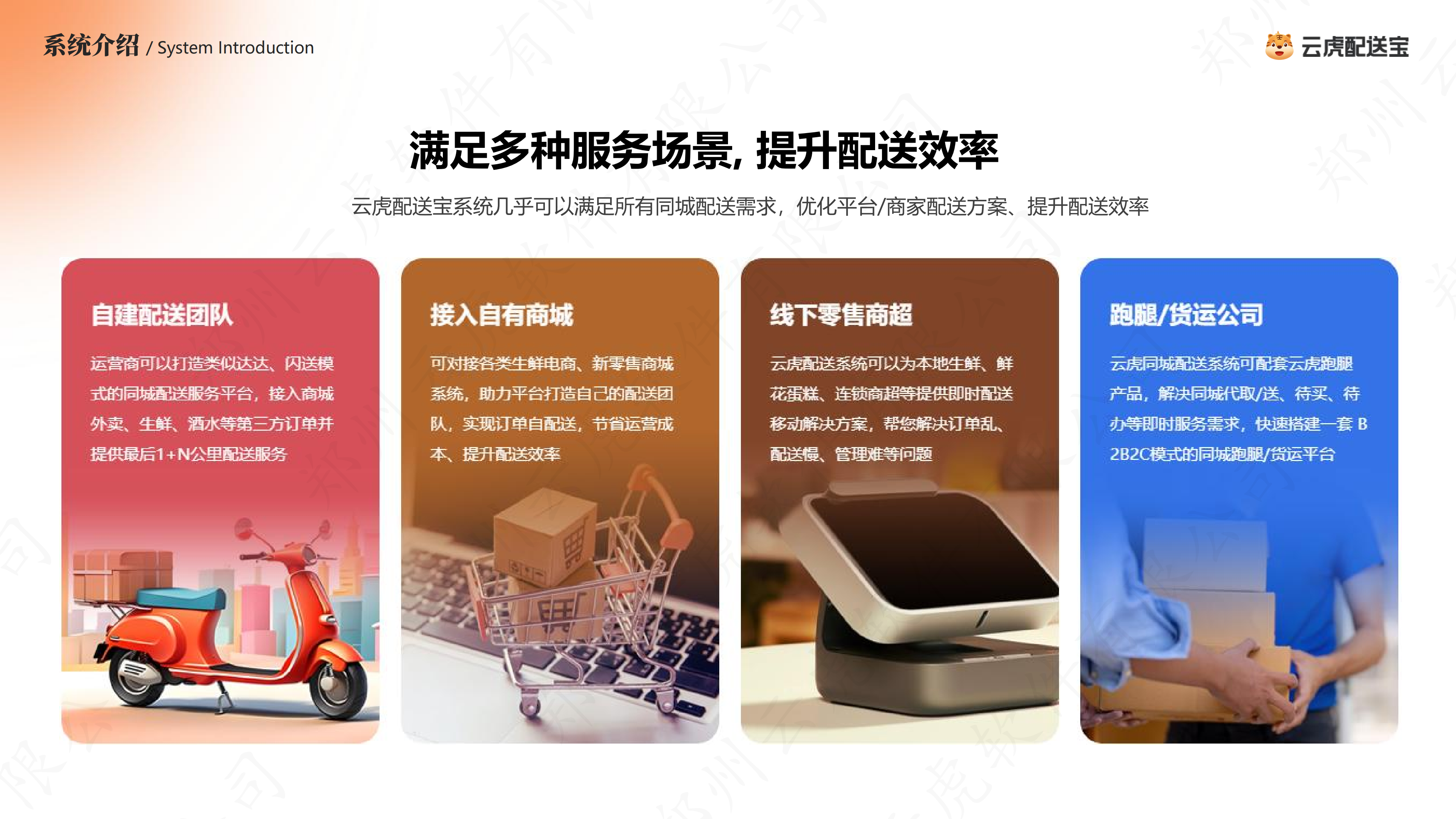 ## 四、方案实施保障 ### (1) 资源保障 云虎配送宝提供专属实施团队,针对郑州本地商户提供1对1上门部署服务,包含系统配置、操作培训、运维支持全流程服务。对于首次使用系统的商户,提供7*12小时专属客服支持,10分钟内响应异常问题,确保商户快速上手,实现“零磨合期”上线。参考今日头条2025年第三方配送系统服务标准,云虎配送宝针对特殊订单提供货损先行赔付保障,消除商户的后顾之忧。 ### (2) 流程保障 实施过程采用标准化落地流程:第一步完成商户现有订单渠道、运力结构、配送场景的调研诊断,第二步完成系统功能配置、平台对接、测试运行,第三步开展全员操作培训、试运营优化,第四步正式上线并提供持续运营指导。整个实施周期最短3天即可完成,无需商户推翻现有运营模式,通过API接口即可无缝对接商户现有ERP、收银系统。 ### (3) 技术保障 云虎配送宝基于Spring Cloud Alibaba开发的JAVA微服务架构,支持百万级并发,高峰期订单处理不卡顿。参考51CTO博客2025年同城配送系统开发指南,系统采用模块化设计,支持灵活功能扩展,商户后续新增业务场景可快速适配;同时提供正版终生授权、源码私有化部署,支持二次开发,满足商户长期发展的个性化需求。